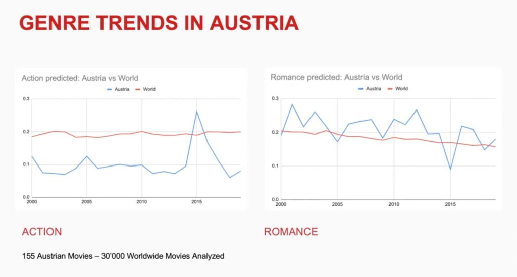 Furthermore, a general case study based on films produced in Austria was presented with the trends in European and American film industry. We have captured many interesting insights which indicates some points that Austrian film industry separates from the rest of the world. One example on that is shown the graph below. The average action amount in Austrian movies are lower than worldwide average while romance amount is slightly more than world average.
